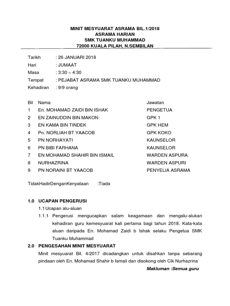 Sebagai contoh sekiranya belaku pertikaian antara kedua belah pihak maka ia boleh merujuk kepada minit mesyuarat bagi menegakkan keadilan dan mengurangkan konflik antara kedua belah pihak. Encik nor risam bin haji kamari kehadiran bilangan. Contoh minit mesyuarat minit mesyuarat merupakan satu laporan mengenai perkara atau hal yang dibincangkan dan diputuskan dalam sesuatu mesyuarat. Berikut merupakan koleksi minit mesyuarat panitia sains pertama.