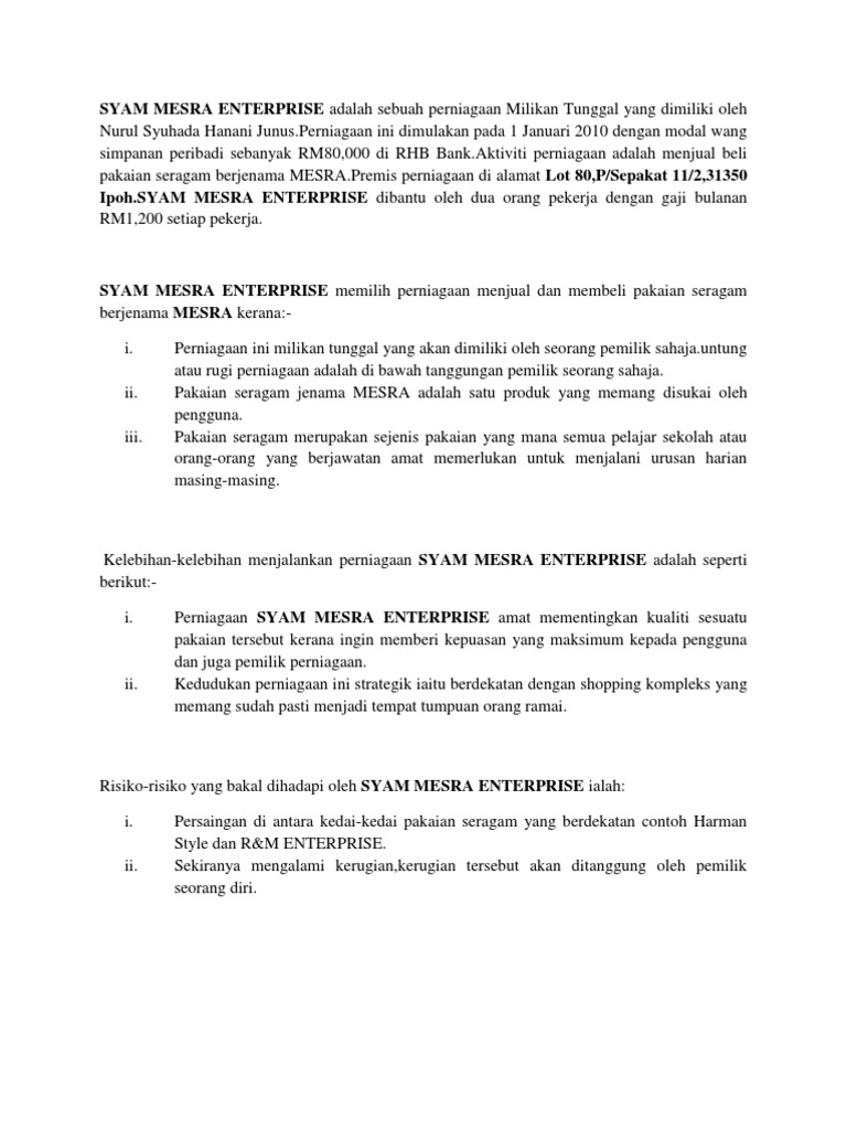 Syam Mesra Enterprise Adalah Sebuah Perniagaan Milikan Tunggal Yang Dimiliki Oleh Nurul Syuhada Hanani Junus