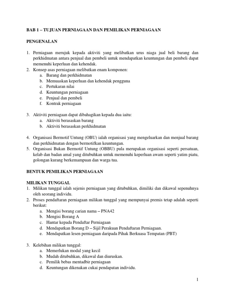 Nota Bab 1 Tujuan Perniagaan Dan Pemilikan Perniagaan Lucky Potato
