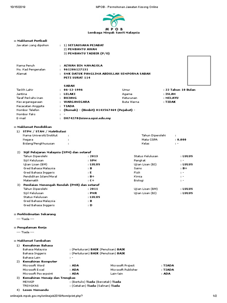 Mpob Permohonan Jawatan Kosong Online Pdf