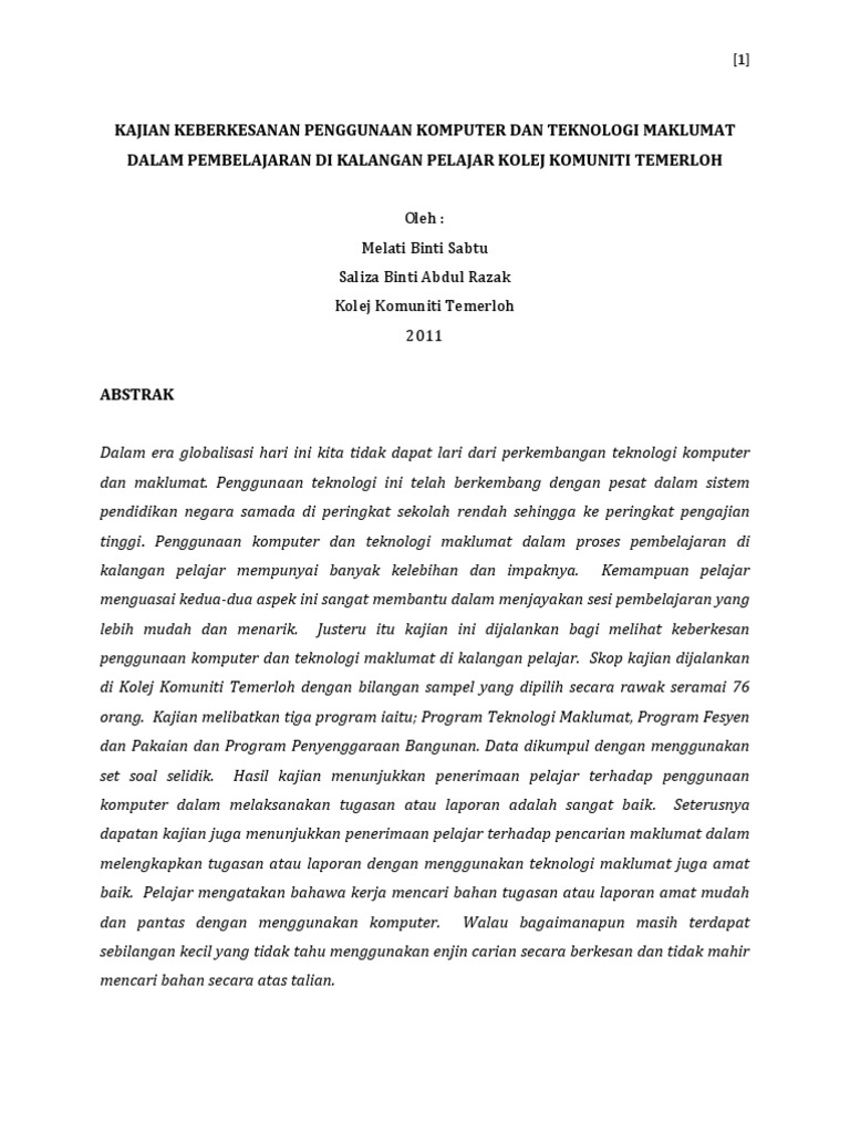 Kajian Keberkesanan Penggunaan Komputer Dan Teknologi Maklumat Dalam Pembelajaran Di Kalangan Pelajar Kolej Komuniti Temerloh