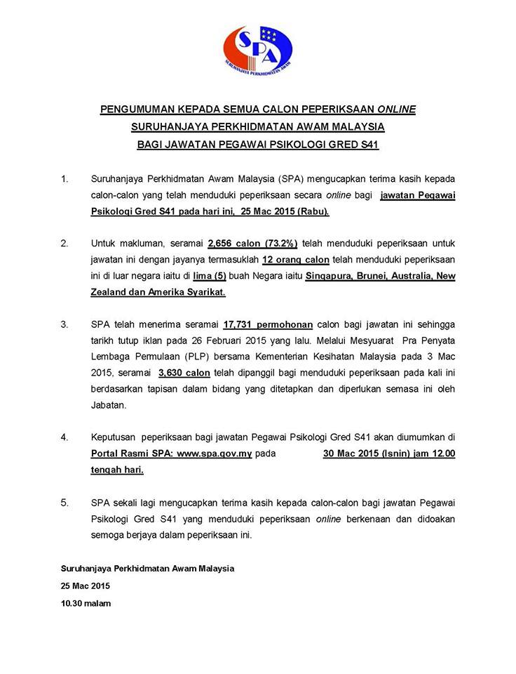 Semakan Keputusan Peperiksaan Pegawai Psikologi Gred S41 Mac 2015 Junablogg