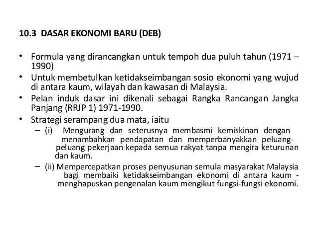 Dasar ekonomi baru deb merupakan satu program sosioekonomi di malaysia yang diperkenalkan dalam rancangan malaysia kedua 1970 1990 oleh perdana menteri tun abdul razak. Menyedari kedudukan ketidakseimbangan sosial ekonomi itu kerajaan telah megusahakan satu pendekatan baru dalam rancangan pembangunan negara yang melibatkan program 20 tahun yang dikenali sebagai dasar ekonomi baru. Matlamat tersurat deb adalah untuk mencapai perpaduan negara dan integrasi nasional dan ia telah digubal dalam konteks strategi serampang dua mata untuk.