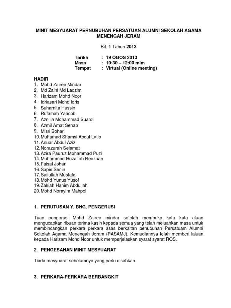 Contoh Minit Mesyuarat Penubuhan Persatuan