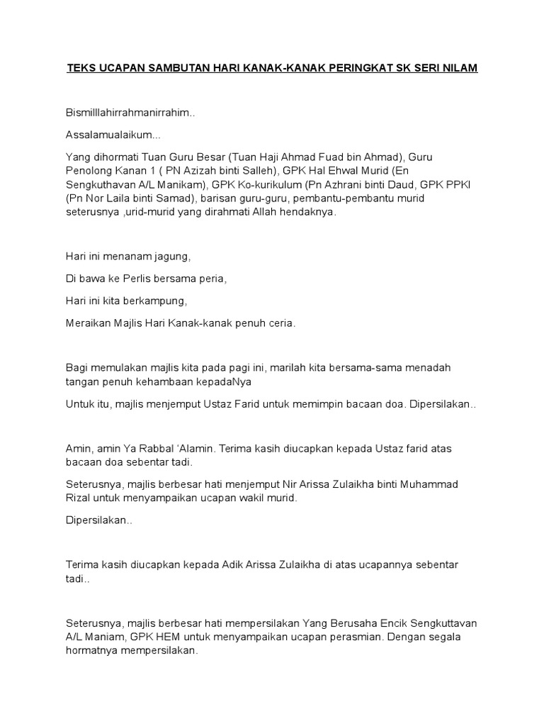 Teks Ucapan Wakil Murid Hari Kanak Kanak