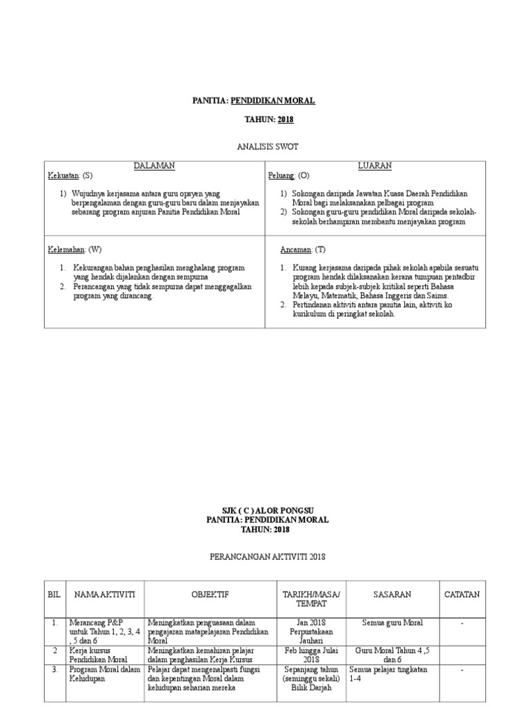Swot Moral Dan Perancangan Aktiviti Pendidikan Moral Dan Pelan Tindakan 2018