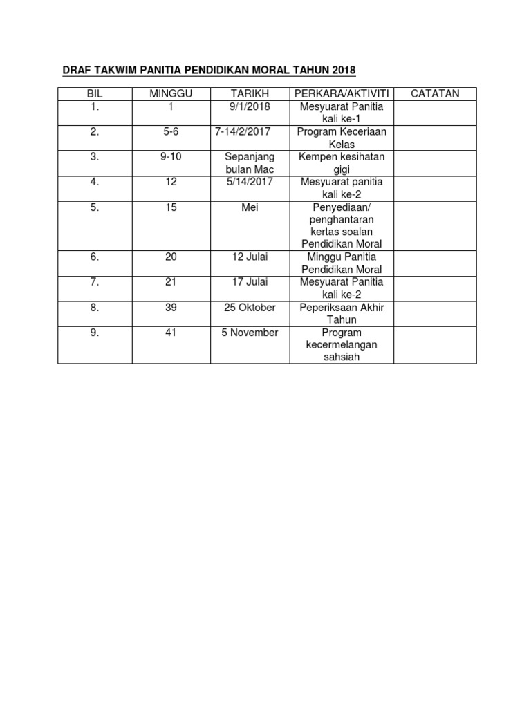 Draf Takwim Panitia Pendidikan Moral Tahun 2018