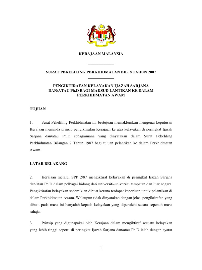 Spp Bil 13 2009 Pekeliling Pengiktirafan Kelayakan Ijazah Sarjana Dan Atau Ijazah Doktor Falsafah Ph D Bagi Maksud Pelantikan Ke Perkhidmatan Awam Pekeliling Terbaru Kerajaan
