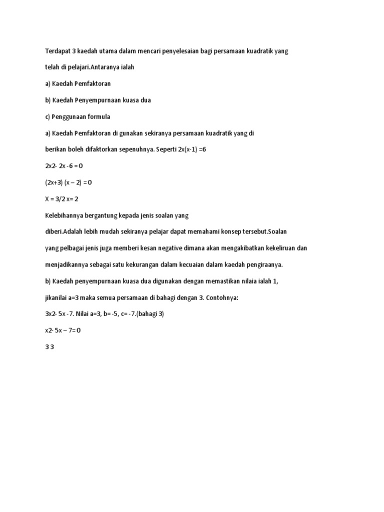 Terdapat 3 Kaedah Utama Dalam Mencari Penyelesaian Bagi Persamaan Kuadratik Yang