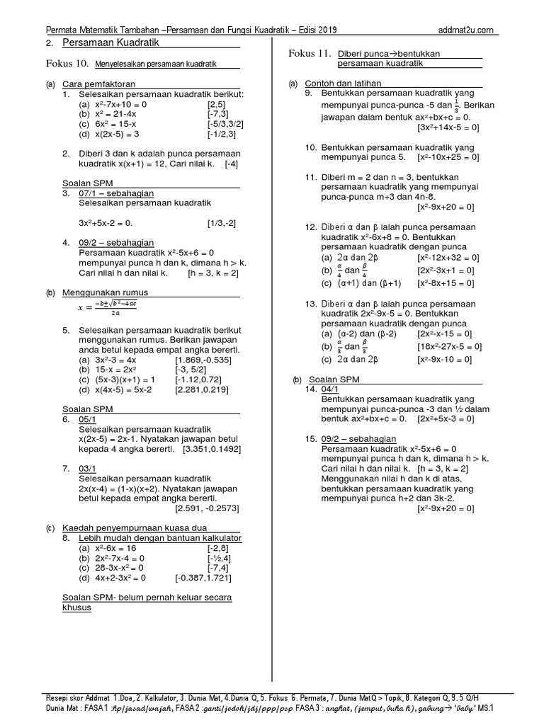 Matematik Tambahan Spm Bab 2 Persamaan Kuadratik